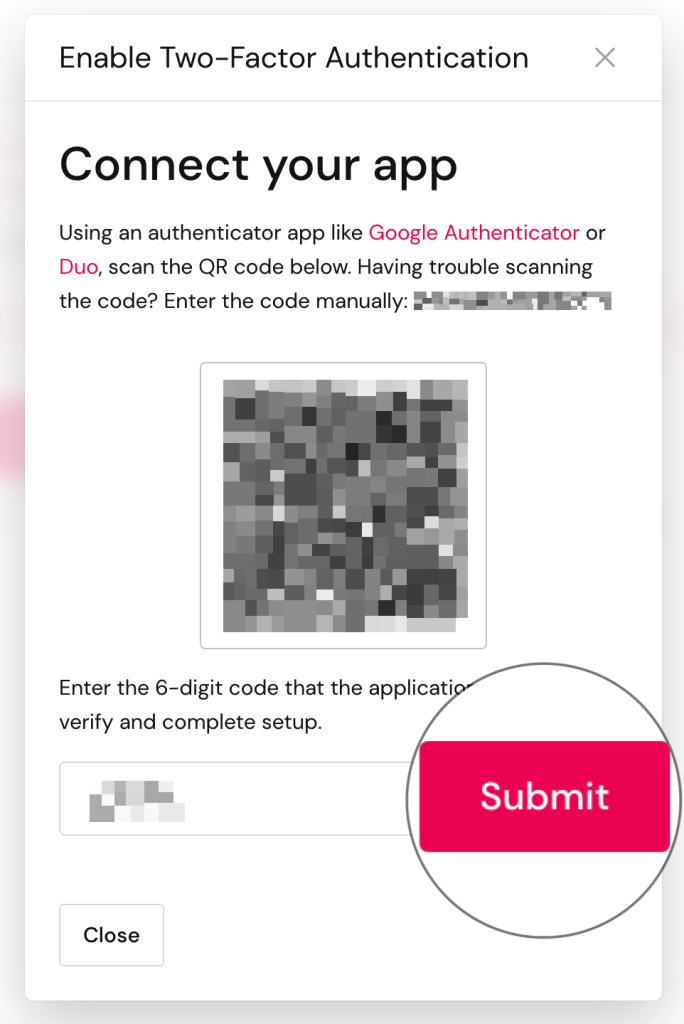 *Note: If for any reason you are having trouble scanning the QR code, you can enter the code that appears next to Enter the code manually field in the popup. That will also generate a 6-digit code you can submit to enable Two-factor authentication.