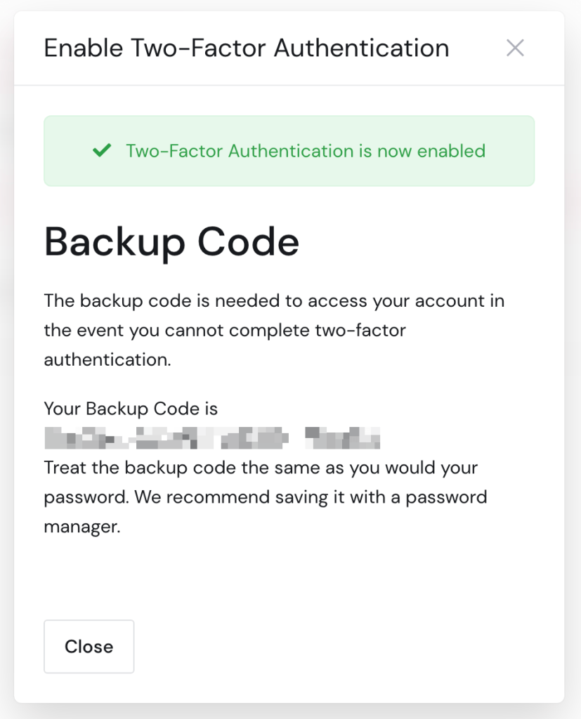 6. Once you submit your code, two-factor authentication will be enabled on your Nexym user portal. There will also be a Backup Code displayed, copy and save that Backup Code in a secure spot. You can use your Backup Code in case you are unable to access your 6-digit two-factor authentication code when signing in.