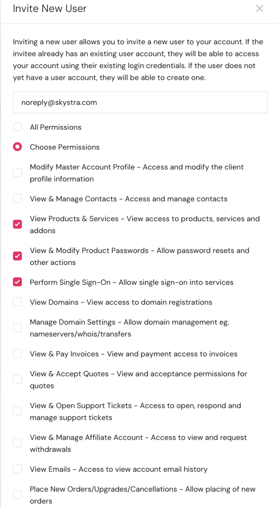 There are additional permissions you can select for your user, however these two will provide access to your hosting account(s) specifically. Once ready, click on the Send Invite button.
