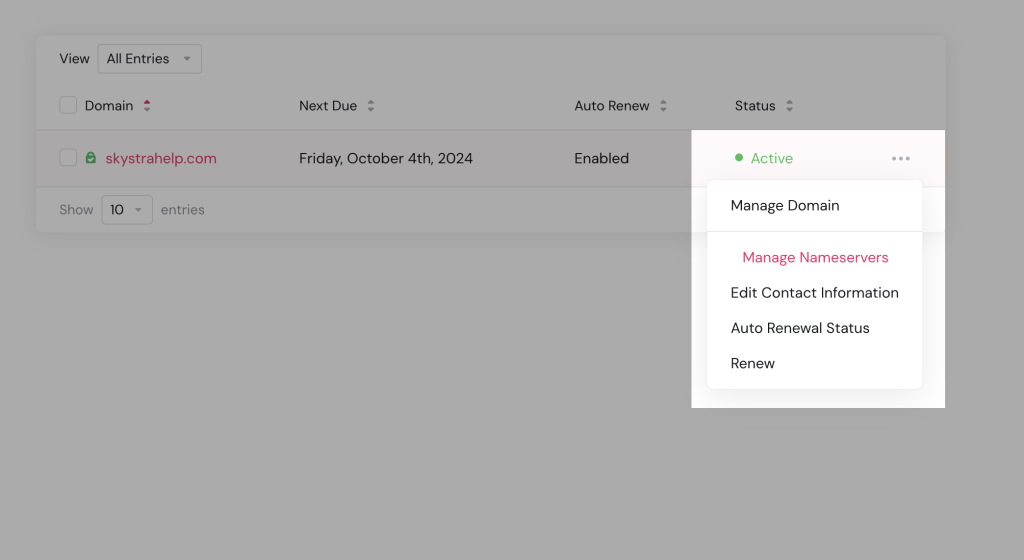 4. Click on Manage Nameservers from the dropdown