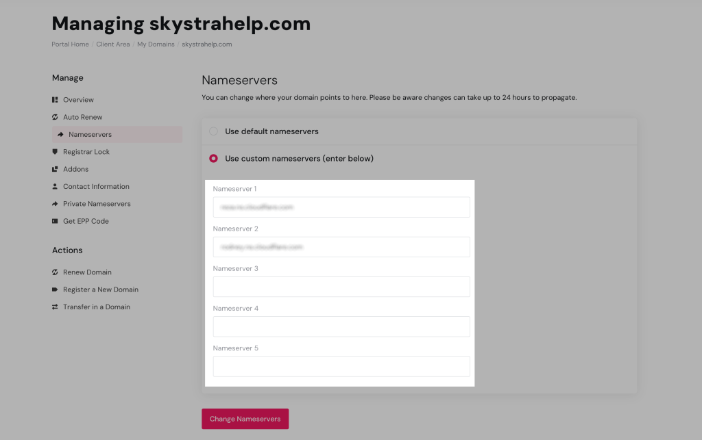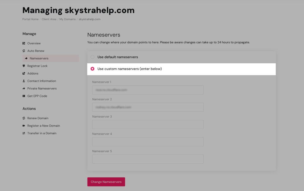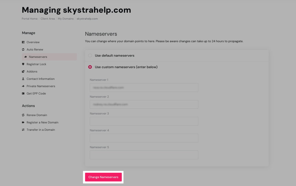 8. Click the Change Nameservers button to apply changes