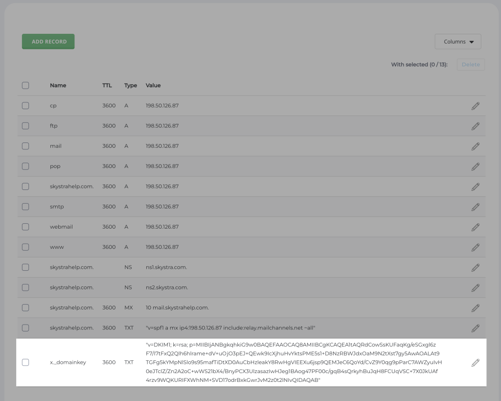 If you are using external nameservers, however, and have your email service connected to the Nexym hosting platform via MX records, you will have to add the default DKIM record from your hosting control panel to your DNS provider’s panel, by following the steps below.