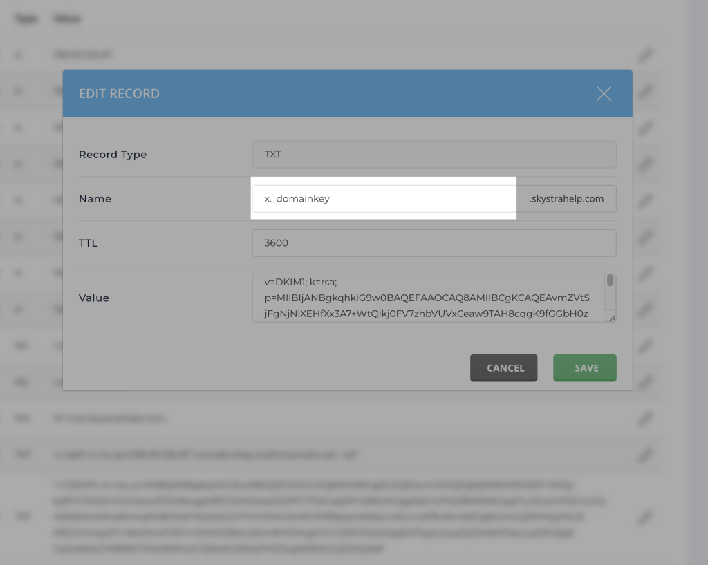 8. Enter the content of the DKIM record, indicated under the Value column, next to the x._domainkey entry. For example, from the screenshot above, the entire DKIM value would be: