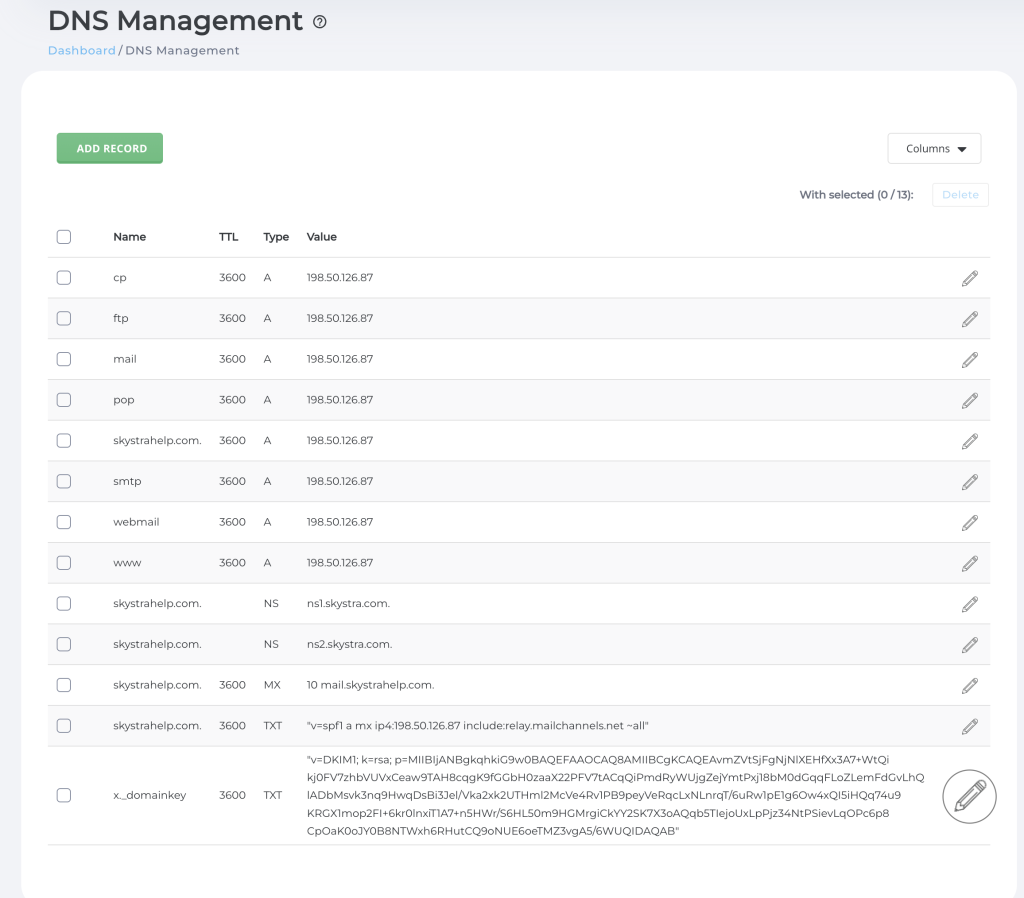 5. Under the Value column, locate the x._domainkey entry – this is your default DKIM entry that needs to be changed to the DKIM record your email provider gave you. Next to this entry, click the pencil icon ✏️ to enable editing.