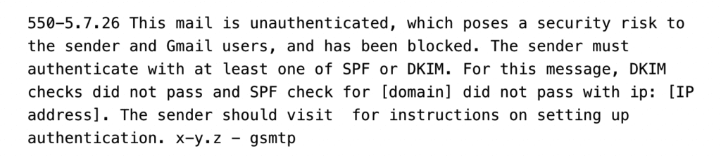 The ‘This mail has been blocked because the sender is unauthenticated. 550-5.7.26 Gmail requires all senders to authenticate with either SPF or DKIM.’ is an email error generated by Google when sending email to Gmail based email addresses.