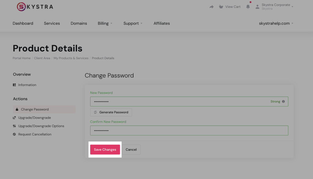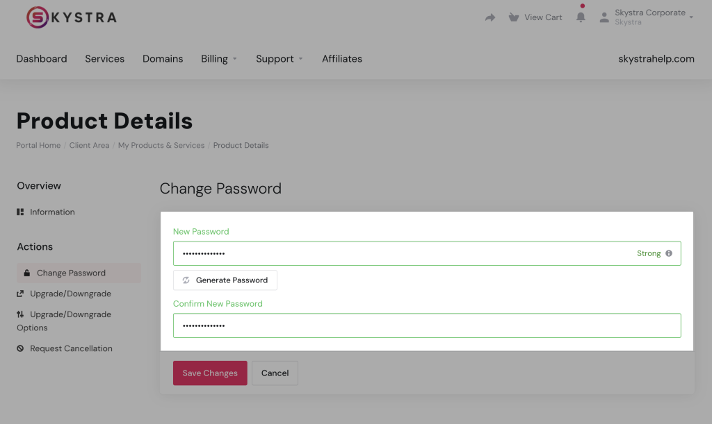4. Insert a new password in the New Password and Confirm New Password fields, or click the Generate Password button for the system to create and insert one for you. It’s best to set a Strong password using letters, numbers, and special characters.