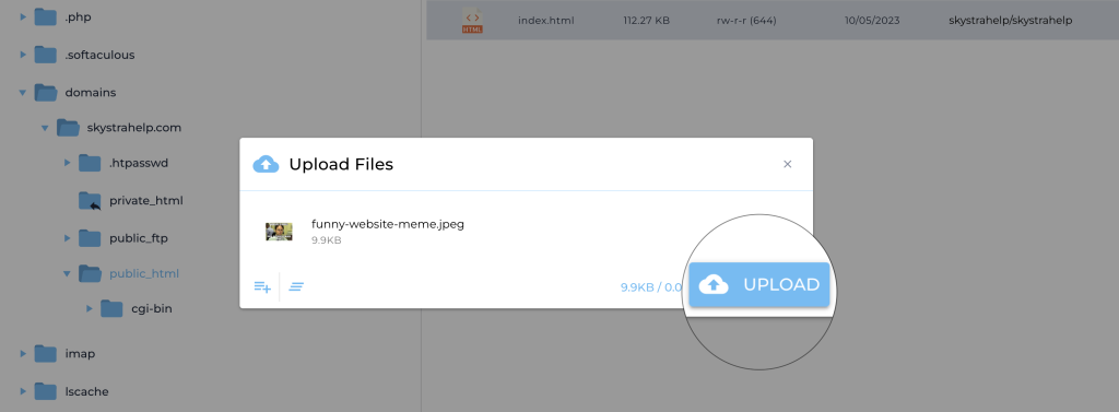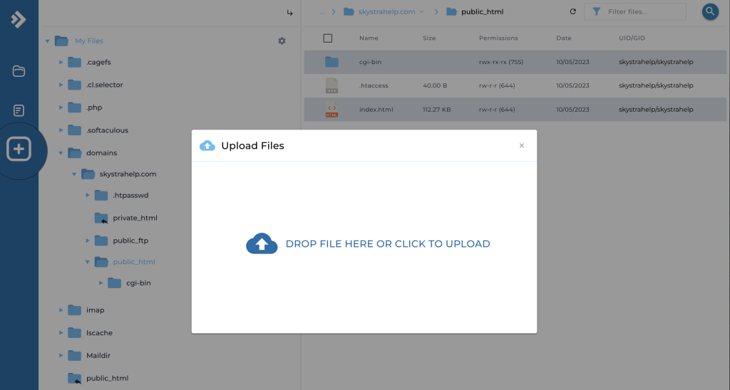 6. Now you are in your domain name’s public_html folder. At this point, you can upload files to your domain’s public_html folder. Click the [+] button on the left hand side to get the file upload popup window.