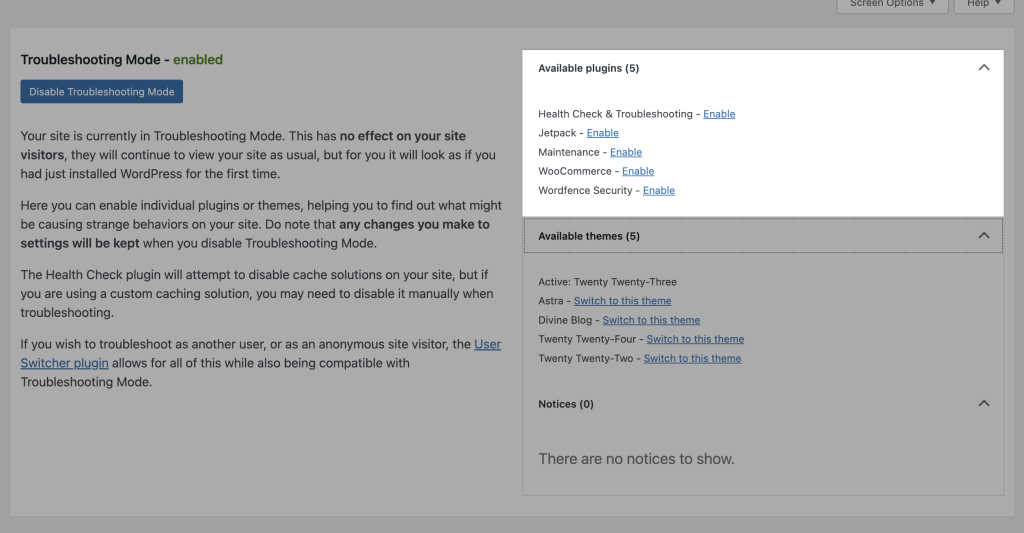 11. Once activated, you will see the Troubleshooting Mode – enabled screen. On this screen, troubleshooting is enabled only for you and your website visitors are not affected