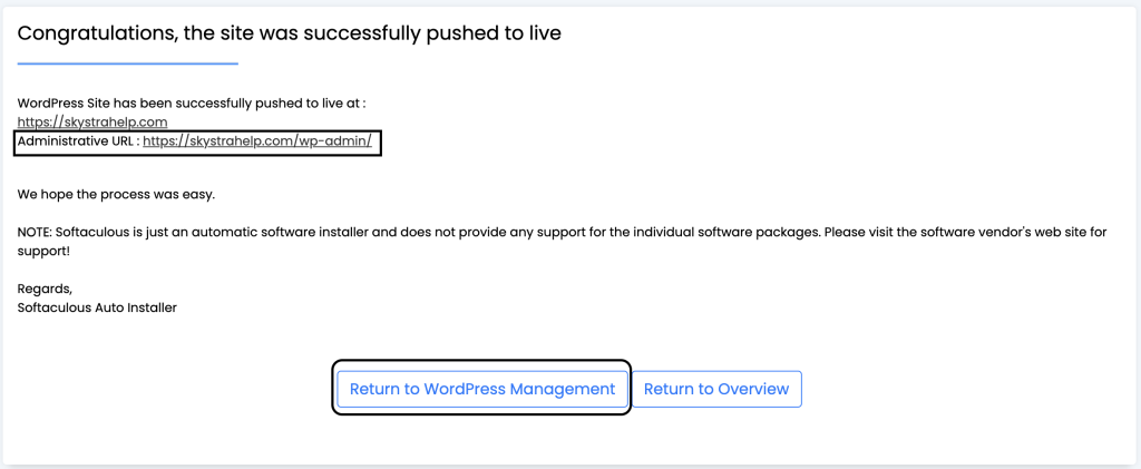 7. On the Congratulations, the site was successfully pushed to live – you will see the WordPress administrative URL – you can use this URL to login to your WordPress admin dashboard (use the same login credentials as always). Alternatively, you can click the Return to WordPress Management button and then the Login button next to your website to sign in.