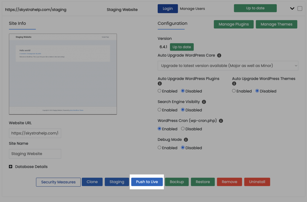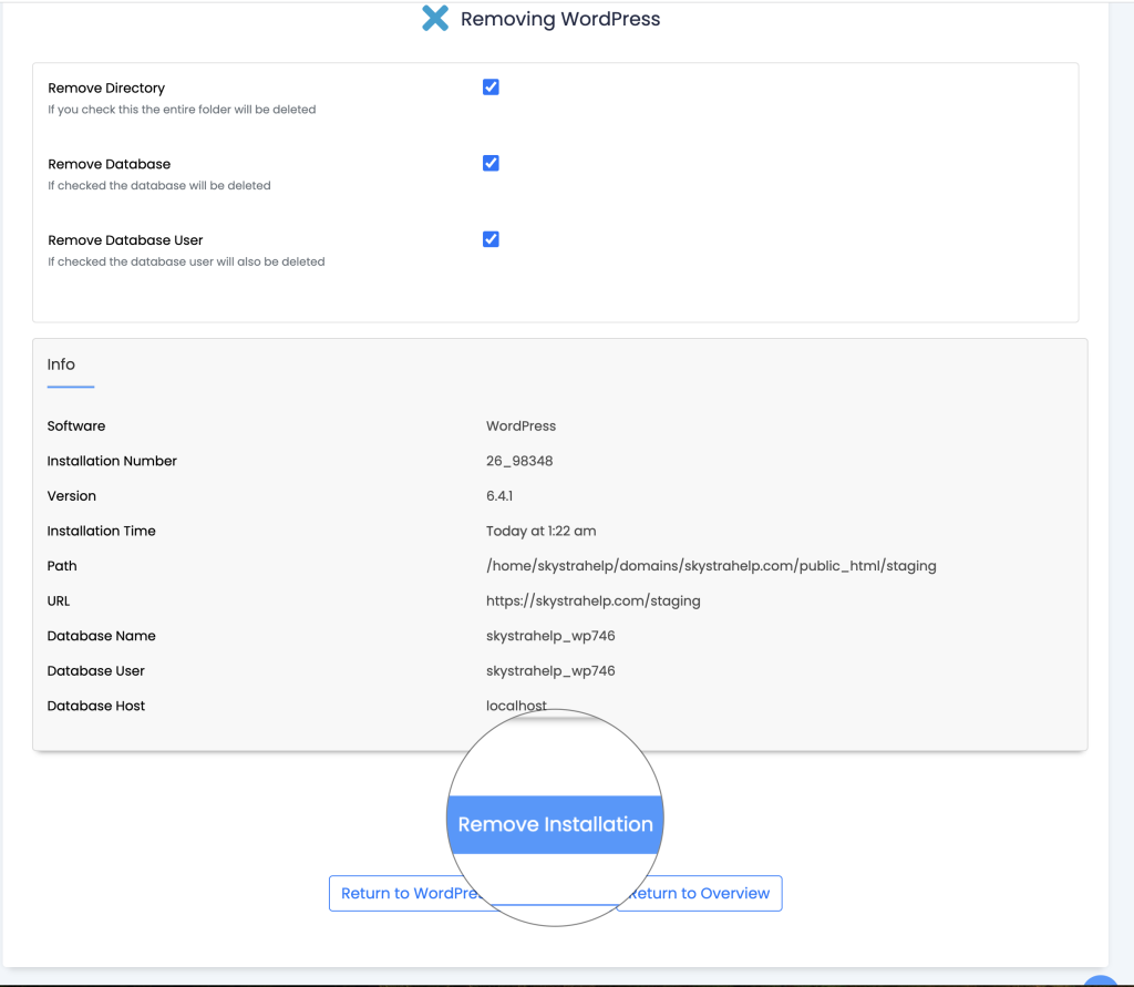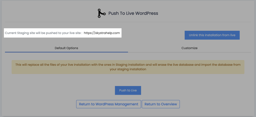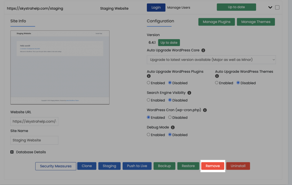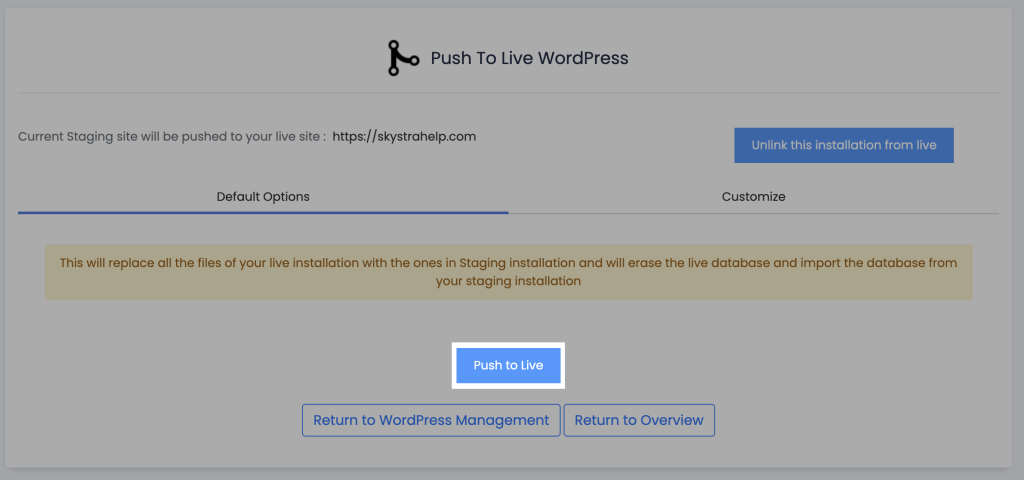This will remove your old staging website. If you’d like to re-stage your website again down the line, use the create staging website guide.