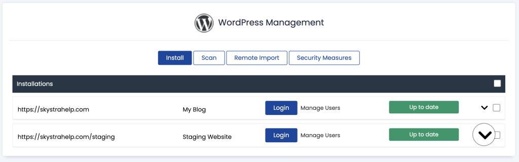 3. Locate your WordPress staging installation row and click the down arrow V