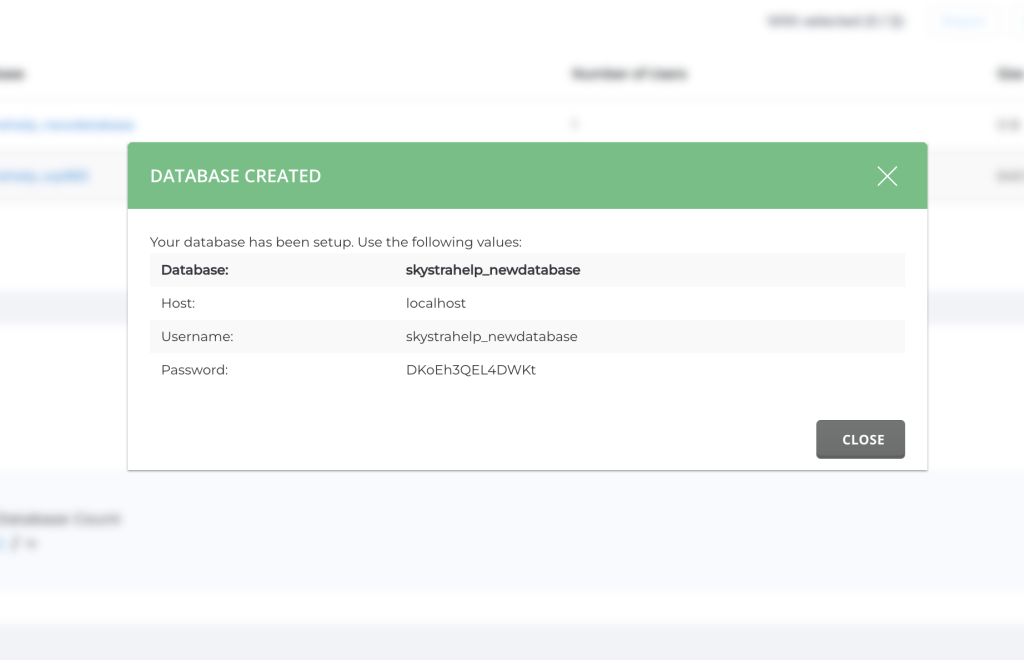 7. You will get a popup confirmation message once your database has been created. The popup will display your database credentials again, if you haven’t done so already, note these details down in a secure spot. Once noted, you can click the Close button.