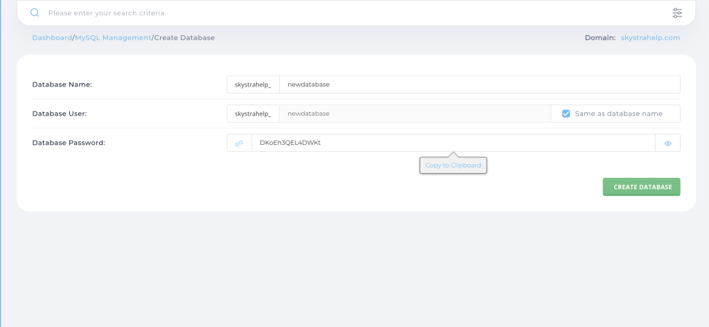5. On the next page, type in your Database Name. This will automatically be your Database User – unless you uncheck the ticked box next to Same as database name. In the password field, generate a new password and/or input your own. If generating one, click the dice ⚁ ⚁ on the left hand side and the system will generate one for you. Then, click on the eye icon to the right 👁️ to reveal it.