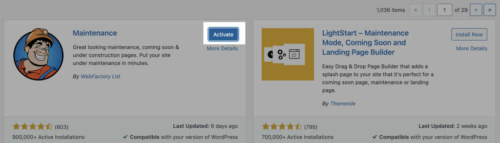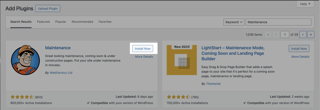 3. Search for the Maintenance plugin and click Install Now