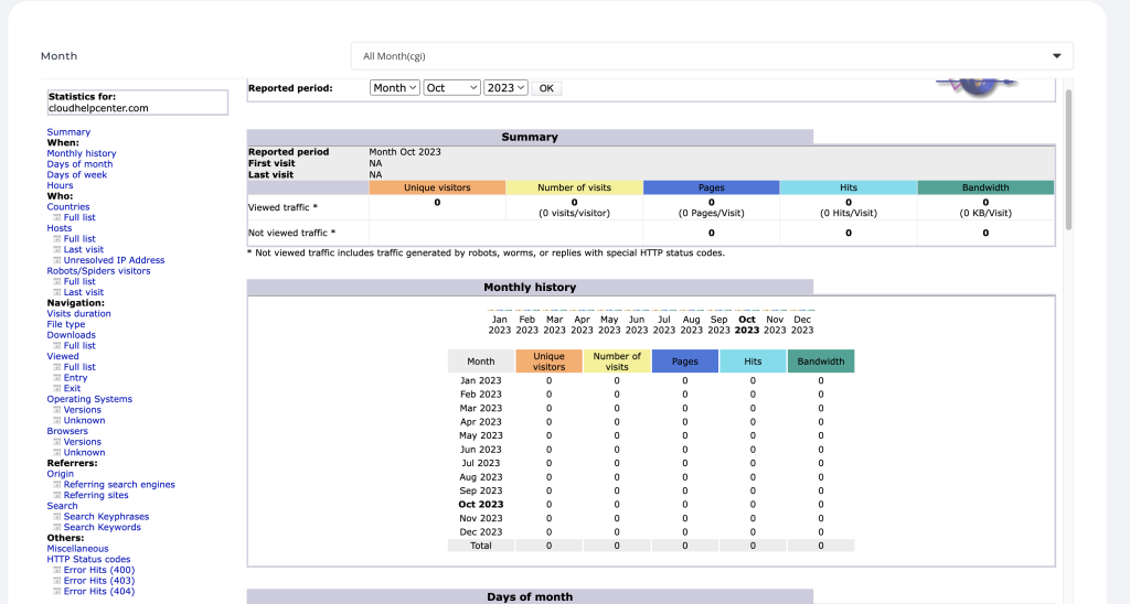 4. The next page will display AWstats for your website, where you can sort reporting periods by month, day, and hour. Key data, including unique visitors and number of visits, is prominently summarized at the top.